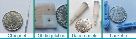 Bei der klassischen Ohrakupunktur werden vorwiegend Metallnadeln verwendet. Dabei handelt es sich um Einwegnadeln, Dauernadeln, Implantate und die Lanzente ...